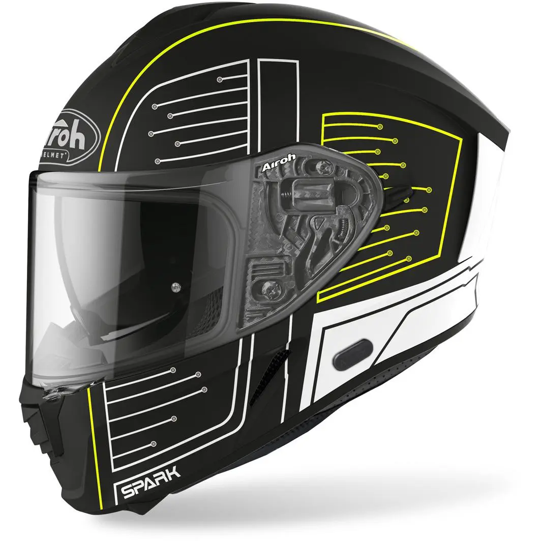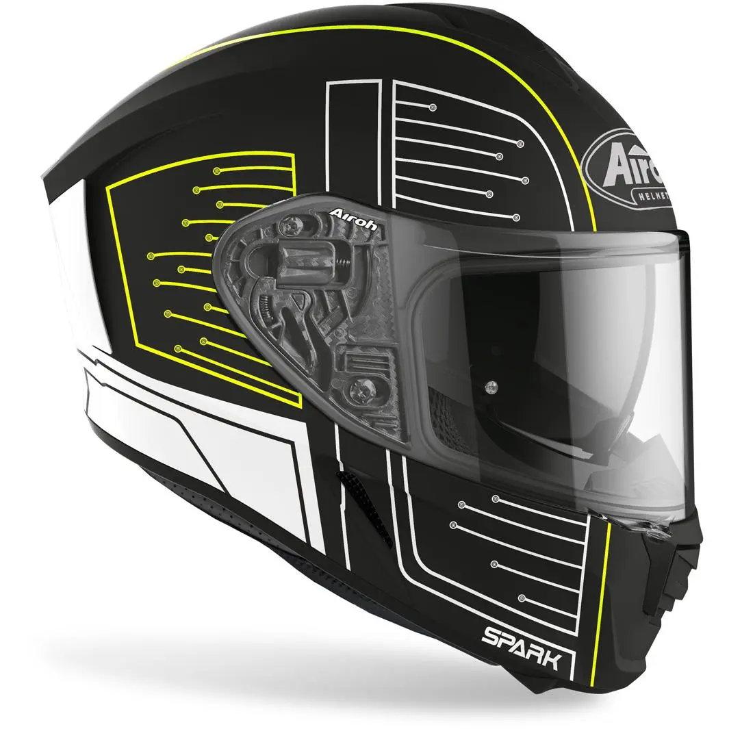 Casque intégral AIROH Spark. 2 tailles de calotte. Coque en thermoplastique HRT. Écran extra-wide à démontage rapide, traité anti-rayures, anti-UV et antibuée. Lentille antibuée Pinlock® incluse. Écran solaire interne rétractable. Fermeture par boucle micrométrique