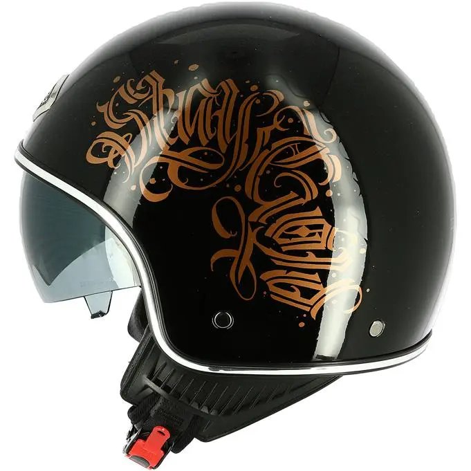 Casque jet. Coque en ABS. Écran solaire. Intérieur entièrement amovible, antibactérien, anti-transpirant et lavable. Fermeture par boucle micrométrique.