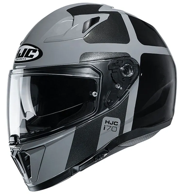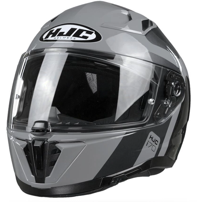 Casque intégral HJC i70. Coque en polycarbonate injecté. 2 tailles de calotte. Écran large Vision Plus. Écran solaire traité anti-rayures. Livré avec une lentille antibuée et un écran clair traité anti-UV. Fermeture par boucle micrométrique.
