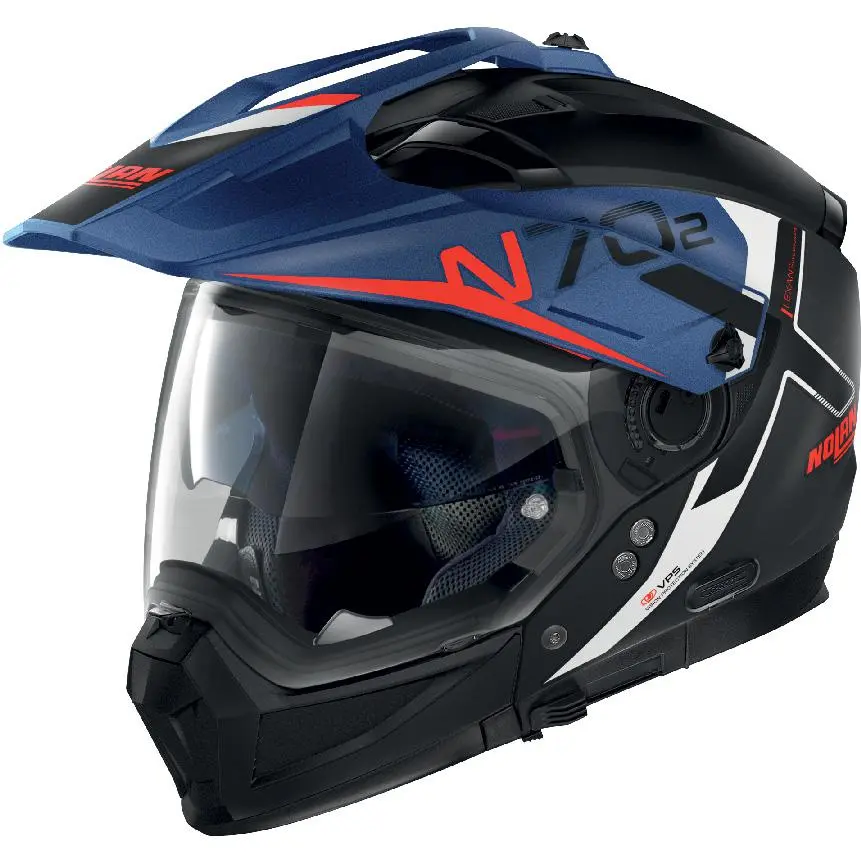 Casque crossover. Coque en polycarbonate. Double homologation ECE 22-05: jet et intégral. 2 tailles de calotte. Livré avec un écran clair traité anti-rayures. Écran solaire interne traité anti-rayures et anti-buée. Système de ventilation « Air BOOSTER Technology ». Prédisposé pour recevoir le système de communication N-Com.
