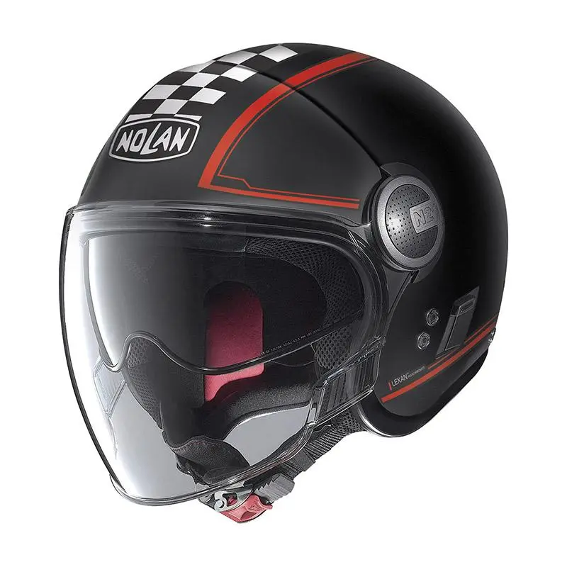 Casque jet. Coque en polycarbonate. 2 tailles de calotte. Double écran solaire rétractable moulé en Lexan® : traité anti-rayures, antibuée et UV 400. Intérieur « Clima confort ». Fermeture par boucle micrométrique Microlock®. Homologation 22-05.